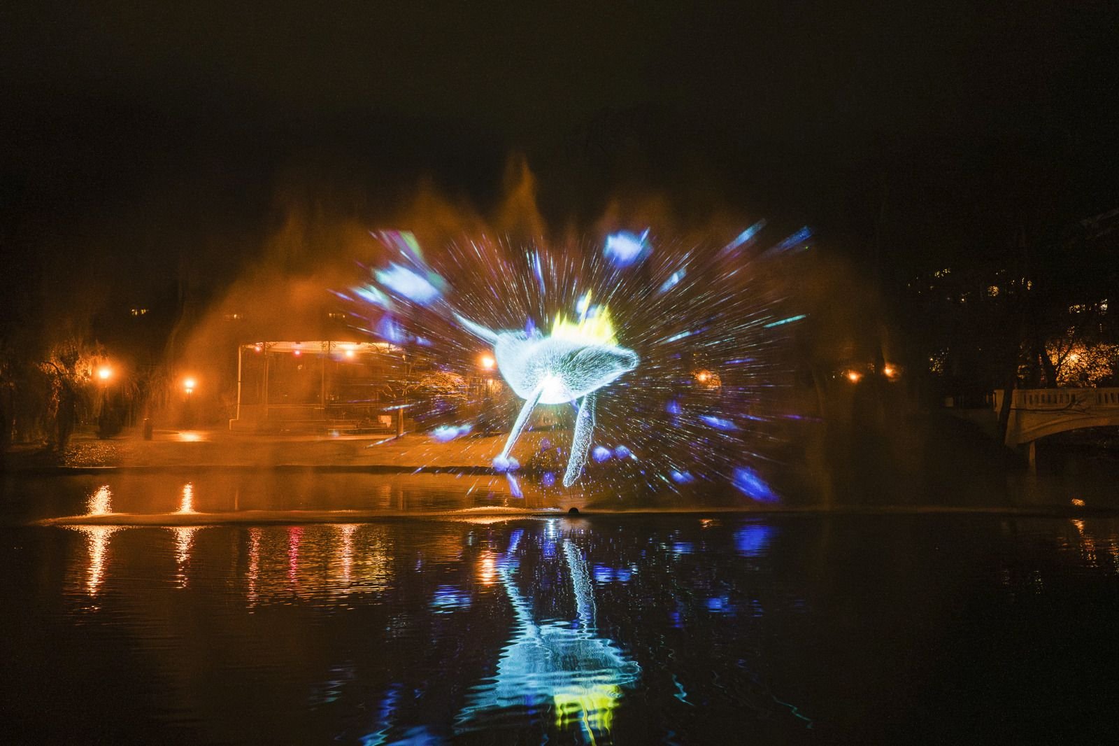 I worked extensively on the Leopoldpark installation: a large-scale 3D animation projected onto a 10×10m waterscreen. A giant whale slowly moves through the scene, carrying fragments of the city on its back, surrounded by fish, birds, and flowing light, a quiet, dreamlike moment where Oostende drifts between sea and land.